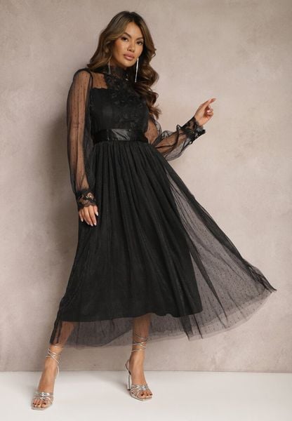 Czarna Sukienka Maxi o Rozkloszowanym Fasonie z Ozdobną Koronką i Tiulem Steilla