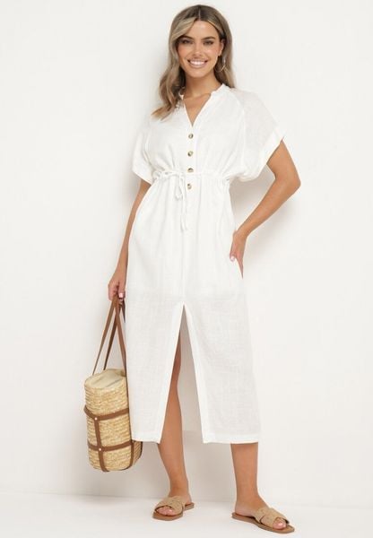 Biała Sukienka Koszulowa z Wycięciami w Talii i i Marszczeniami Zapinana na Guziki Quvlea