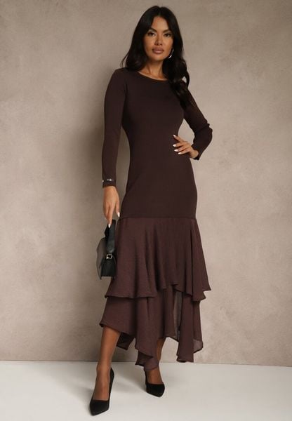 Brązowa Dopasowana Sukienka z Wiskozą Zdobiona Falbankami u Dołu Setra