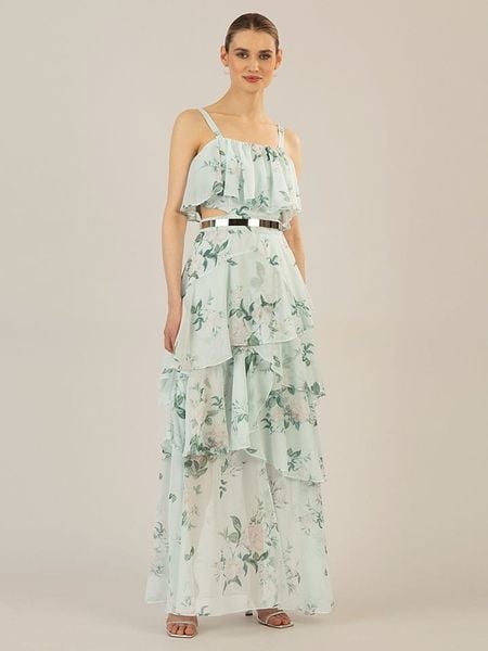 – ramiączka: regulowane- dekolt: karo- zapięcie: suwak na plecach- zdejmowany pasek: metal- detale: tiul- krój: prosty- wzór: kwiatowy- look: warstwy