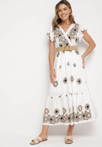 Biało-Czarna Wiskozowa Sukienka z Paskiem w Ornamentny Wzór Nilorine