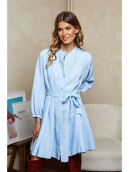 – dekolt: okrągły- zapięcie: listwa guzikowa- zdejmowany pasek: tkanina- detale: falbanki- krój: taliowany- look: jednokolorowy