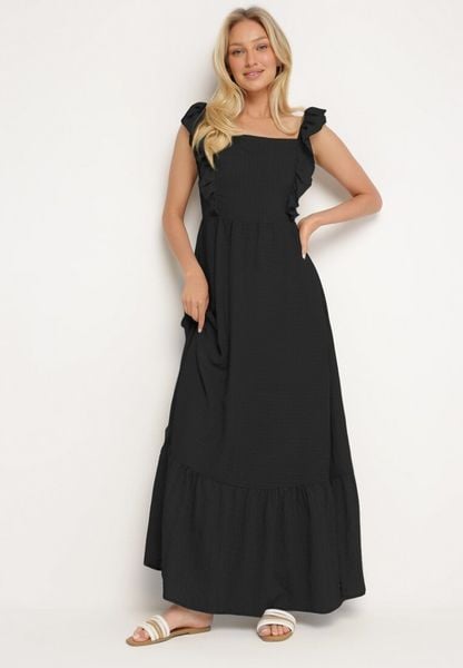 Czarna Sukienka z Wiązaniem na Plecach na Ramiączkach z Falbankami i Gumką w Pasie Rollas
