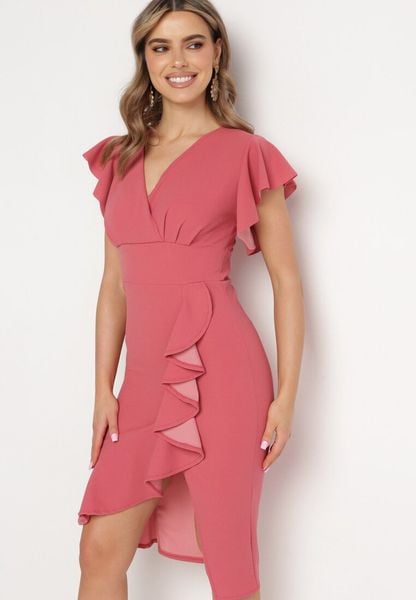 Ciemnoróżowa Dopasowana Sukienka z Kopertowym Dekoltem i Falbankami Leolani