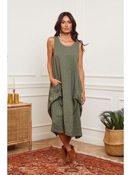 – czysty len- ramiączka: szerokie- dekolt: okrągły- kieszenie: wpuszczane- krój: prosty- look: jednokolorowy