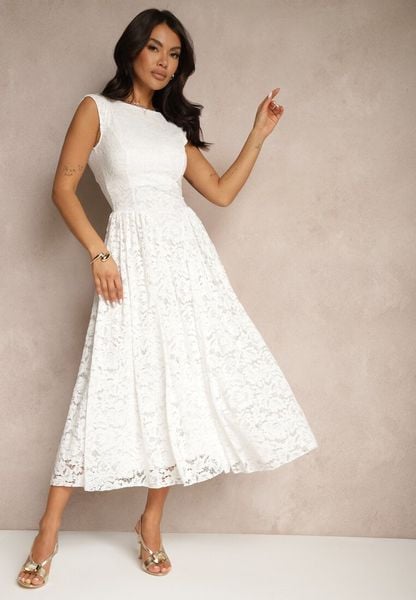 Biała Rozkloszowana Sukienka z Koronki z Wycięciem na Plecach Meltewia