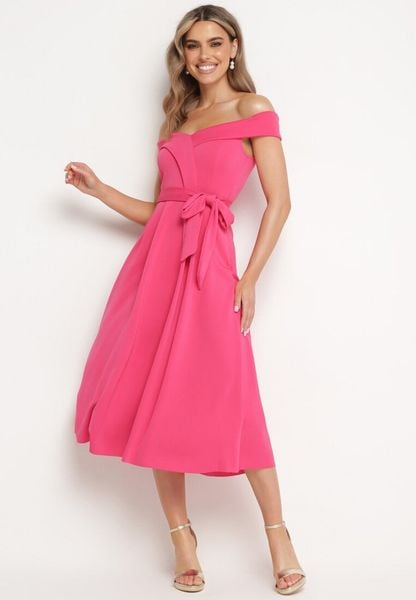 Fuksjowa Elegancka Sukienka o Fasonie Hiszpanki z Materiałowym Paskiem Xaelia