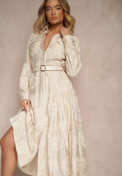 Beżowa Sukienka o Rozkloszowanym Kroju Koszulowym z Bawełną i Paskiem Merichelle