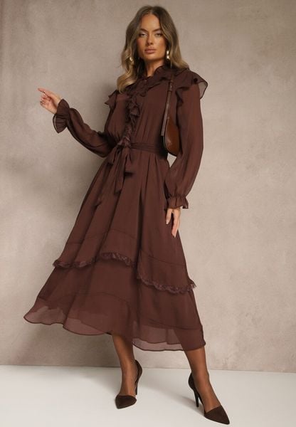 Brązowa Sukienka o Rozkloszowanym Kroju z Falbanami i Metaliczną Nicią Ravilynn