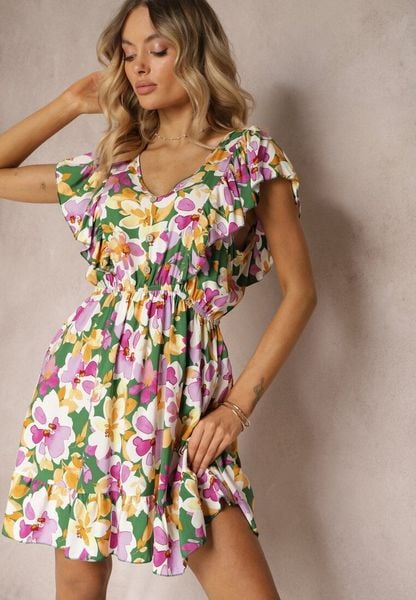 Zielono-Różowa Taliowana Bawełniana Sukienka w Kwiaty z Falbanami przy Ramionach z Gumką w Talii Nelova