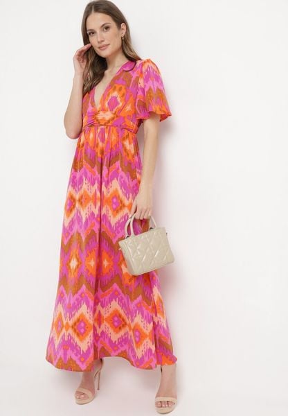 Fioletowo-Pomarańczowa Sukienka Rozkloszowana z Trójkątnym Dekoltem w Abstrakcyjny Wzór Valmana