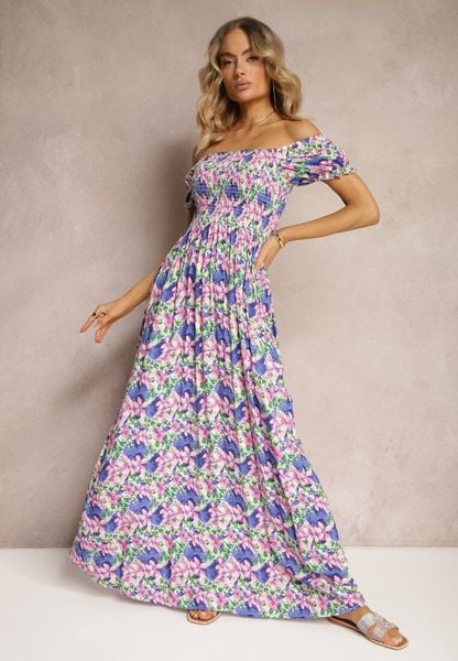 Fioletowo-Niebieska Hiszpanka Sukienka o Rozkloszowanym Kroju i Gumkami przy Dekolcie Kaseria