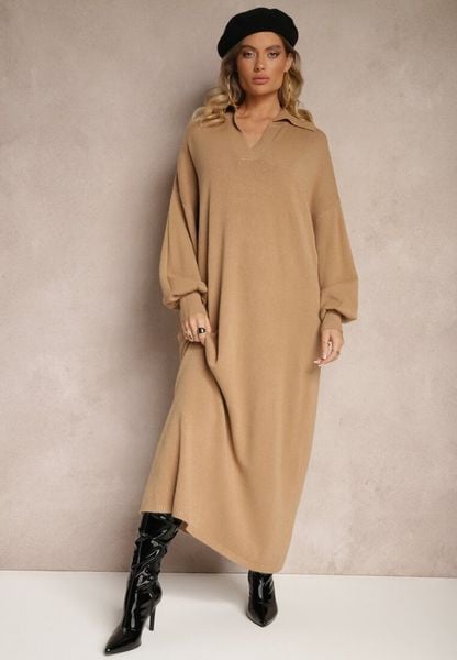 Ciemnobeżowa Sweterkowa Sukienka z Wiskozą o Pudełkowym Kroju Ozdobiona Kołnierzykiem Clarinnae