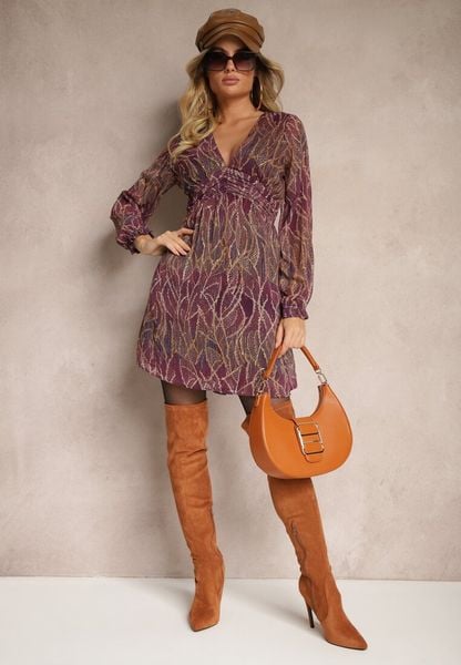 Fioletowa Taliowana Sukienka z Wiskozą o Rozkloszowanym Kroju Zdobiona Metaliczną Nicią Mesinae