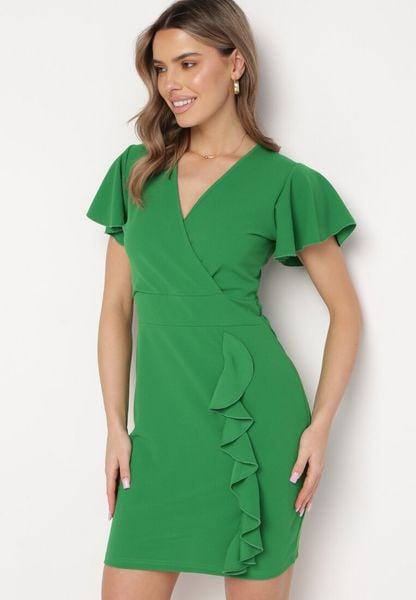 Zielona Dopasowana Sukienka Mini z Kopertowym Dekoltem i Ozdobną Falbanką Gwendara