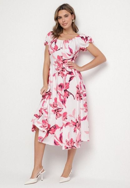 Jasnobeżowa Sukienka w Kwiaty z Dekoltem Łódką z Bawełną o Rozkloszowanym Kroju Annilva