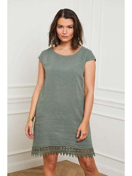 – czysty len- dekolt: okrągły- kieszenie: wpuszczane- detale: szydełkowana koronka- krój: prosty- look: jednokolorowyWskazówka: Na metkach odzieży tej marki znajdują się rozmiary francuskie. Rozmiarówka została przez nas przeliczona. Podane do wyboru warianty rozmiarów odpowiadają standardowym europejskim rozmiarom konfekcji. Prosimy zapoznać się z zamieszczonym objaśnieniem rozmiarów: