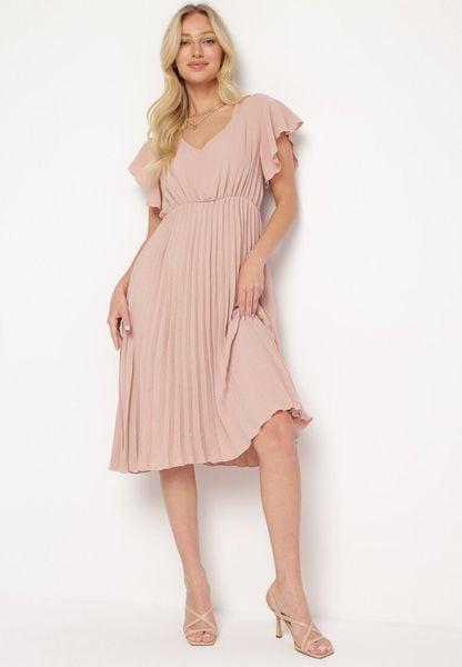 Ciemnoróżowa Sukienka Plisowana o Rozkloszowanym Fasonie i Trójkątnym Dekolcie Rissara