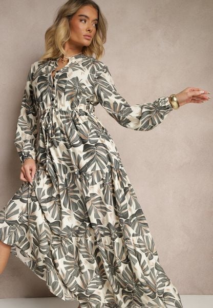 Beżowo-Szara Rozkloszowana Sukienka z Wiskozą w Roślinny Wzór Edirionea