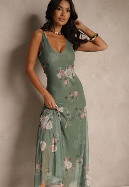 Ciemnozielona Sukienka Siateczkowa w Kwiaty Milosea