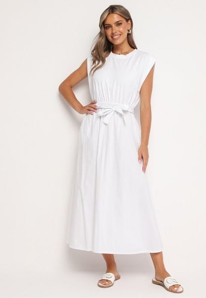 Biała Bawełniana Sukienka z Materiałowym Paskiem o Rozkloszowanym Kroju Wladea