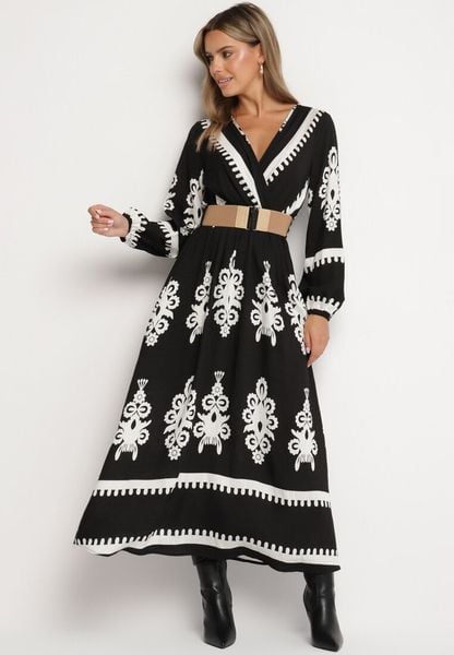 Czarna Wzorzysta Sukienka z Wiskozą o Kopertowym Kroju z Gumką i Paskiem Zinalise