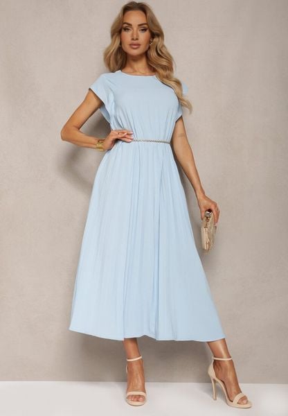 Niebieska Rozkloszowana Sukienka z Plisowaniem i Krótkim Rękawem Hevina
