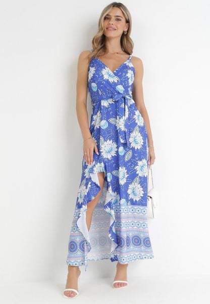 Niebieska Sukienka Maxi z Bawełny na Cienkich Ramiączkach z Falbanką i Kwiatowym Printem Miora