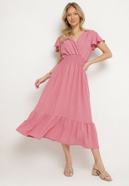Różowa Sukienka o Rozkloszowanym Kroju z Kopertowym Dekoltem i Gumką w Talii Reiliana