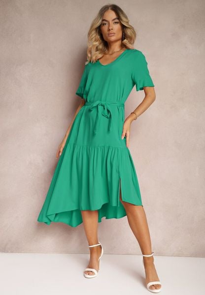 Ciemnozielona Pudełkowa Sukienka z Falbankami i Materiałowym Paskiem w Talii Dimrias