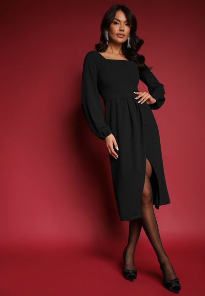 Czarna Sukienka Koktajlowa z Kwadratowym Dekoltem i Kopertowym Dołem Felinala