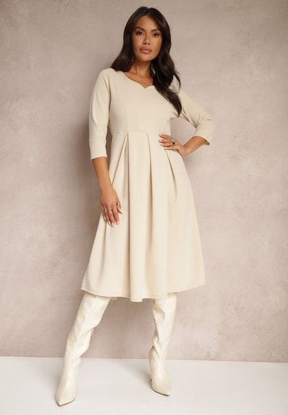 Beżowa Sukienka o Rozkloszowanym Kroju z Rękawem Długości 3/4 Nomini