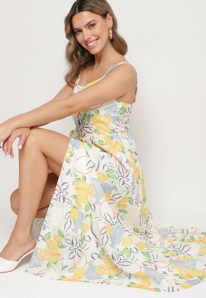 Beżowa Sukienka z Bawełny ze Wzorem Cytryn Evitriss