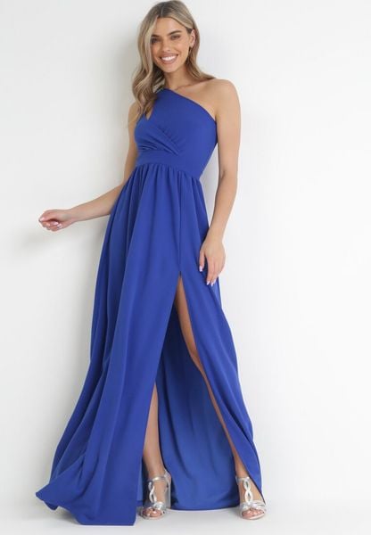 Granatowa Sukienka Maxi Na Jedno Ramię z Rozcięciem na Dole Jasminta