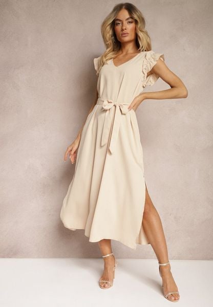 Beżowa Sukienka Wiązana w Pasie z Rękawem z Falbanką z Rozcięciami i Cyrkoniami Fernesta