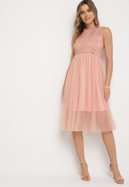 Ciemnoróżowa Koronkowa Sukienka Midi z Rozkloszowanym Dołem z Tiulu Peirene