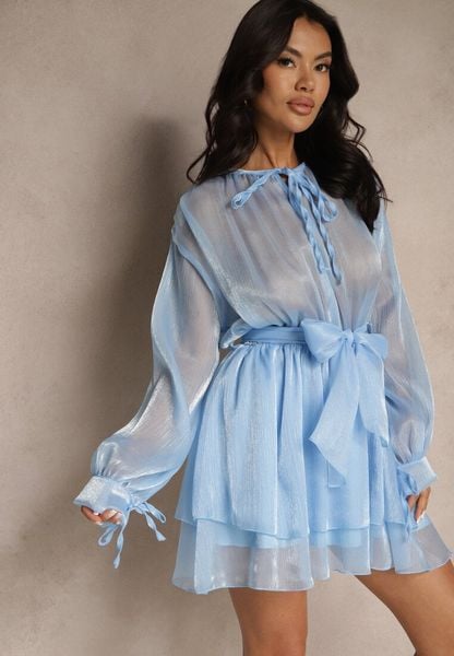 Niebieska Rozkloszowana Sukienka z Paskiem i Wiązaniem Savare