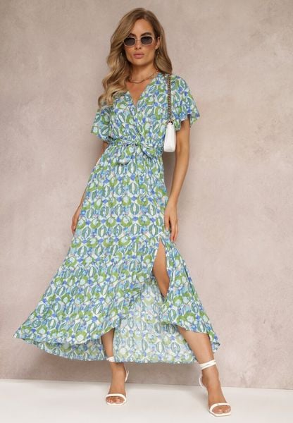 Zielona Sukienka z Wiskozy i Kopertowym Dekoltem w Fantazyjny Print Abai