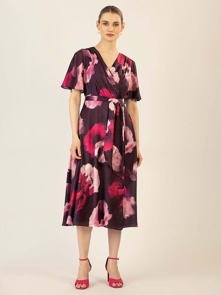 – dekolt: V- zapięcie: suwak na plecach- krój rękawów: motylek- zdejmowany pasek: tkanina- kieszenie: wpuszczane- krój: litera A- wzór: kwiatowy- look: imitacja satyny