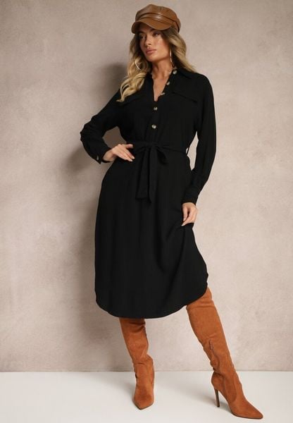 Czarna Sukienka z Bawełny o Koszulowym Kroju Wiązana w Talii Zinrose