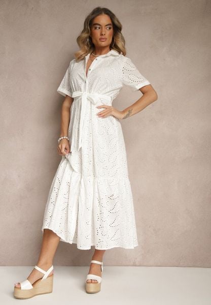 Biała Ażurowa Sukienka z Bawełny Koszulowa Ozdobiona Paskiem Fevorette