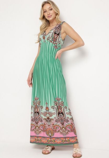 Zielona Sukienka z Troczkami w Ramionach Rozkloszowana z Dekoltem w V Araxeda