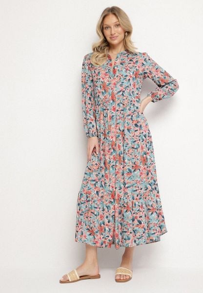 Różowo-Niebieska Sukienka z Górą Zapinaną na Guziki w Kwiaty Barbeira
