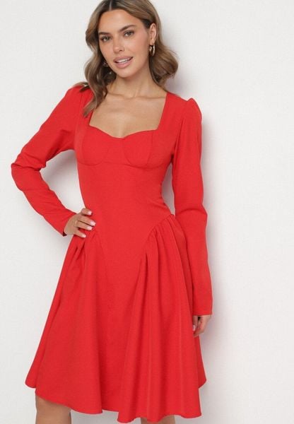 Czerwona Mini Sukienka Dopasowana z Usztywnianym Kwadratowym Dekoltem Olimpidia