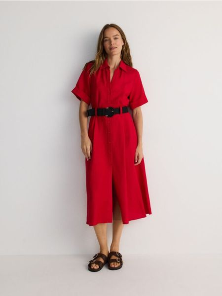 Sukienka o rozkloszowanym fasonie, wykonana z tkaniny z lnem i wiskozą.