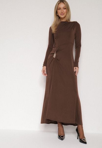 Brązowa Wieczorowa Taliowana Sukienka Ozdobiona Marszczeniem i Metaliczną Aplikacją Emirella