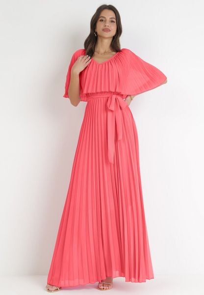 Różowa Sukienka Plisowana z Szeroką Falbaną Przy Dekolcie Dinara