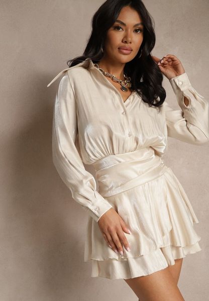 Beżowa Wiskozowa Sukienka o Koszulowym Fasonie z Falbanami Lioelle