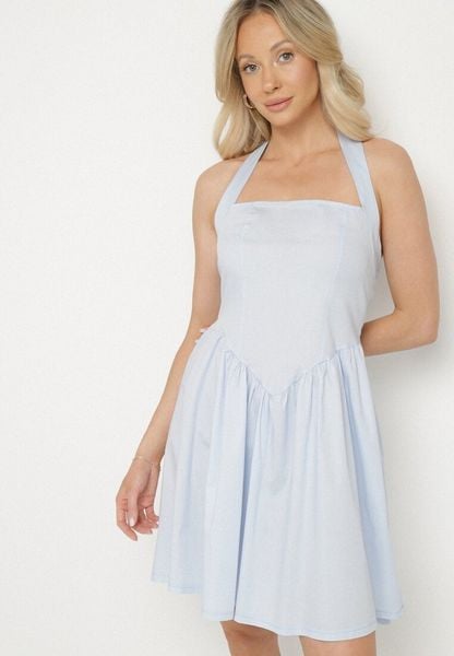 Jasnoniebieska Bawełniana Sukienka Rozkloszowana na Szyję Kolaniela