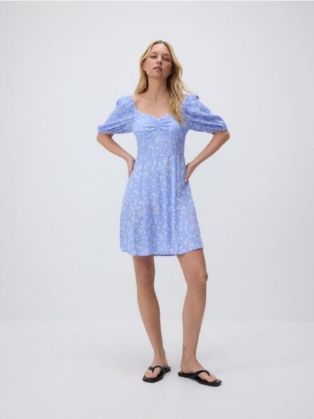 Sukienka o rozkloszowanym kroju, wykonana z wzorzystej tkaniny z wiskozy.